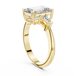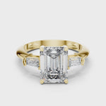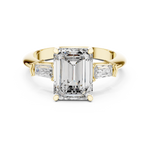 An emerald-cut center diamond, accentuated by baguette side stones, creates a refined geometric beauty. The clean lines and brilliance reflect modern minimalism blended with classic allure.