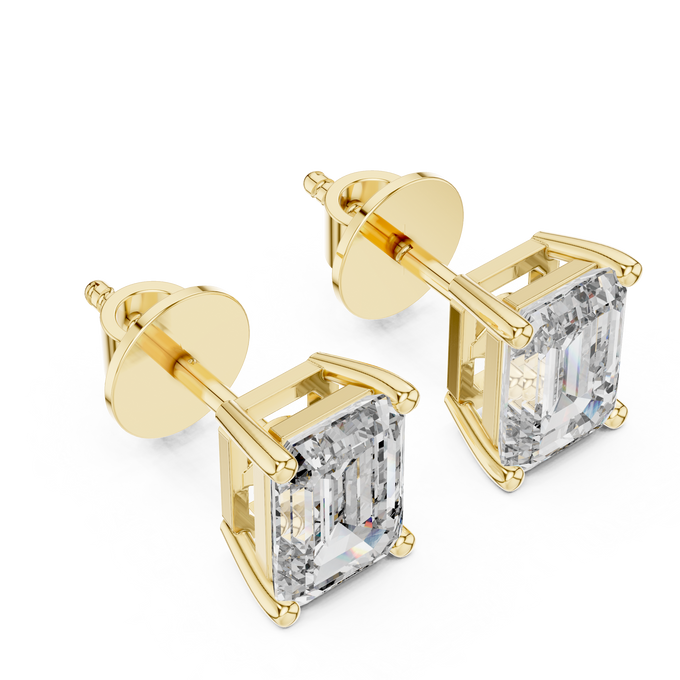 Featuring emerald-shaped diamonds, these studs celebrate geometric perfection and elegance. The step-cut facets enhance their clarity and sparkle, offering a graceful statement of confidence and class.