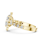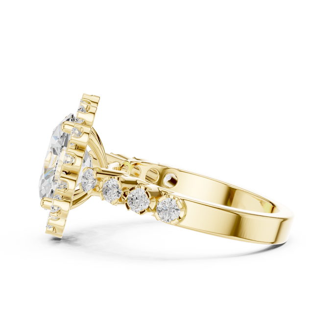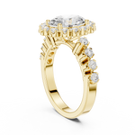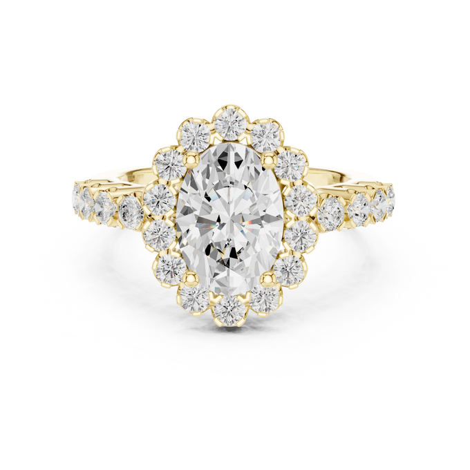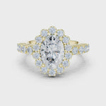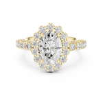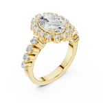 This enchanting ring features a captivating oval-cut diamond surrounded by a dazzling halo of round diamonds, extending beautifully along the band. The radiant arrangement enhances brilliance from every angle, symbolizing love and light.