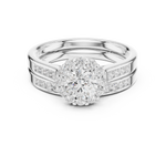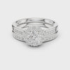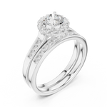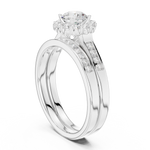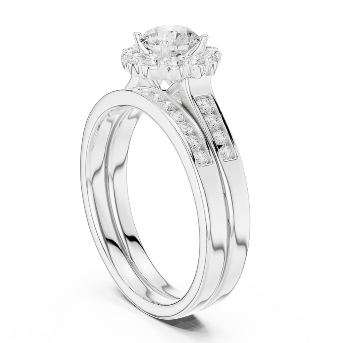 This stunning creation features a round-cut diamond embraced by a halo of light. The double-band structure, enhanced with sparkling diamonds, represents two souls intertwined in perfect harmony and everlasting beauty.