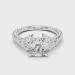 This captivating ring showcases a brilliant cushion-cut diamond, delicately secured in a sleek four-prong setting. The luminous band glimmers with diamonds, creating a graceful harmony of sparkle and sophistication that radiates timeless elegance.