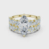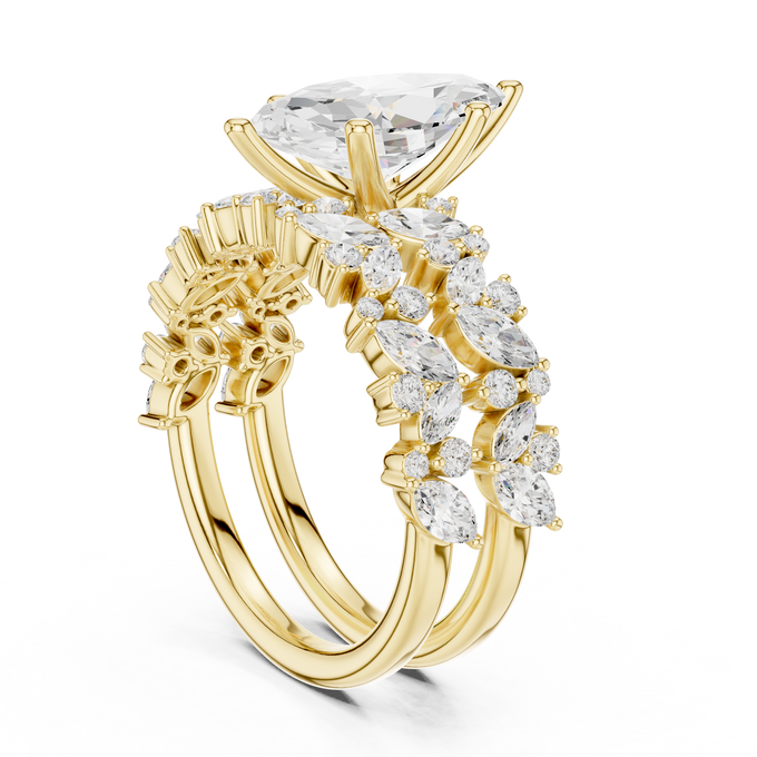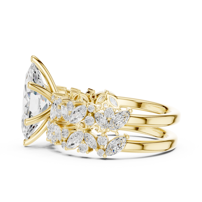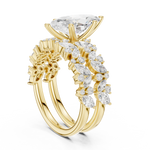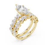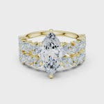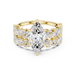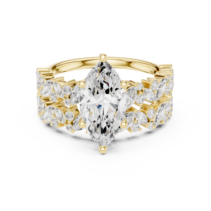 Featuring a dazzling central diamond, this ring is adorned with marquise and round diamonds that flow harmoniously along a twin-band setting. Its ethereal brilliance and intricate craftsmanship evoke celestial beauty, making it a perfect symbol of love and grace.