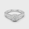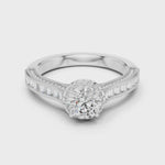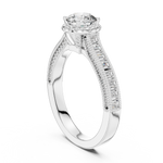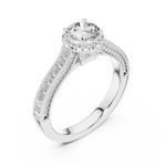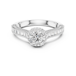 Infused with warmth and brilliance, this elegance solitaire ring features a captivating round-cut diamond with a band of gleaming accent stones. A harmonious blend of classic design and modern refinement.