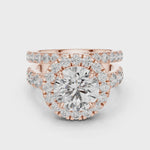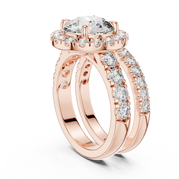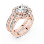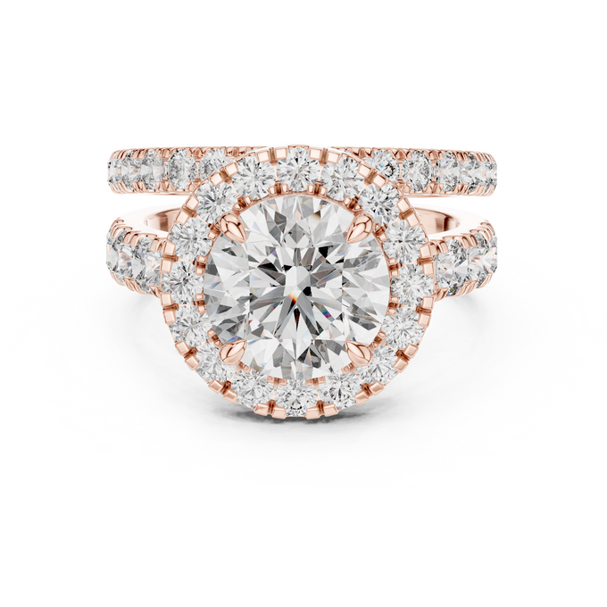 Inspired by blooming beauty, this radiant glow bridal ring set highlights a luminous center diamond encircled by a radiant halo. The coordinating pavé band amplifies its brilliance, making it a perfect symbol of eternal commitment and exquisite craftsmanship.