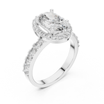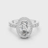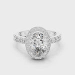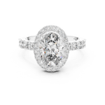 A breathtaking oval-cut diamond shines at the center of this halo ring, surrounded by a circle of shimmering accent stones. The diamond-studded band adds extra brilliance, making this piece a perfect expression of love, grace, and timeless sophistication.