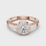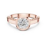 The Seraphine Bezel Diamond Ring shines with understated elegance. A captivating round diamond is set in a secure bezel, enhanced by the soft glow of rose gold and intricate side detailing. This ring beautifully balances strength and grace, making it an exquisite choice for a modern bride or fine jewelry lover.