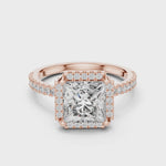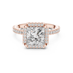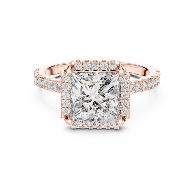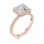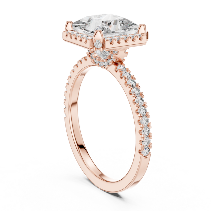 A princess diamond glows at the heart of this elegant ring, embraced by a slender diamond-lined band. Its clean lines and luminous sparkle evoke a sense of refined luxury and enduring romance.