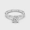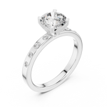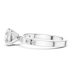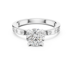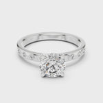 A timeless statement of elegance, this exquisite ring features a dazzling round brilliant-cut diamond at its center, radiating unmatched sparkle. The band is adorned with perfectly spaced accent diamonds, enhancing its brilliance with refined symmetry.