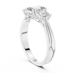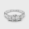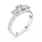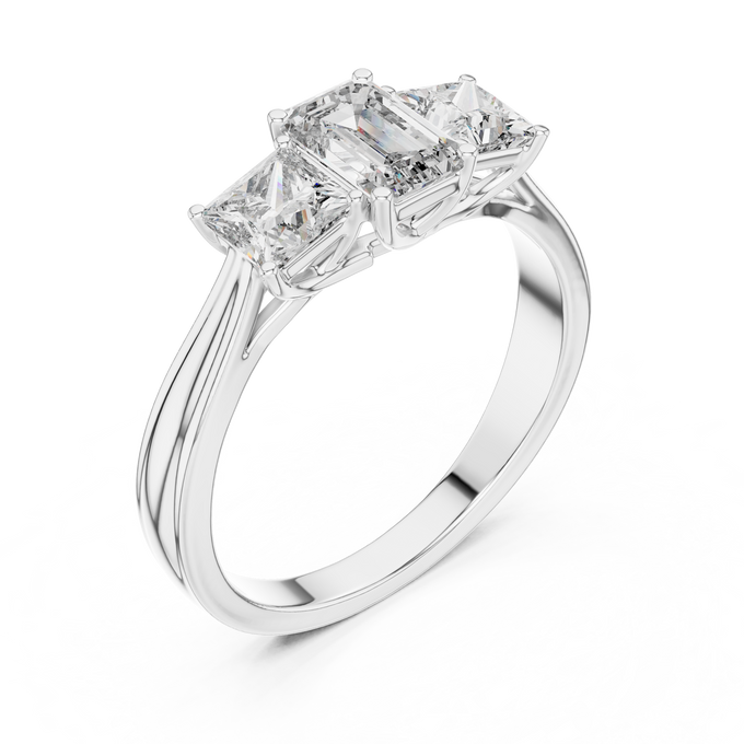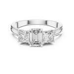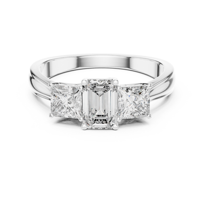 This refined ring showcases a stunning emerald-cut diamond at the center, flanked by two princess-cut diamonds on each side. The trio of perfectly matched stones symbolizes the past, present, and future of your love. A masterpiece of brilliance and balance, radiating elegance and everlasting devotion.