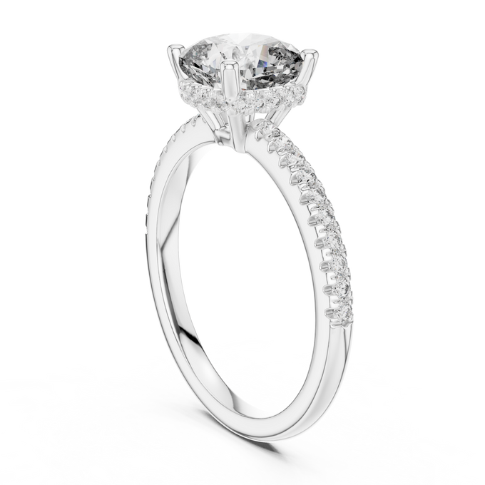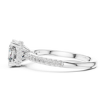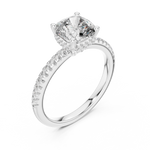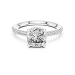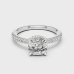 A stunning cushion-cut diamond takes center stage in this exquisite ring, elevated by a shimmering pavé band that enhances its brilliance.