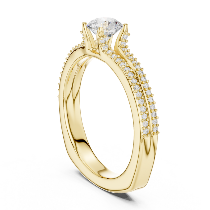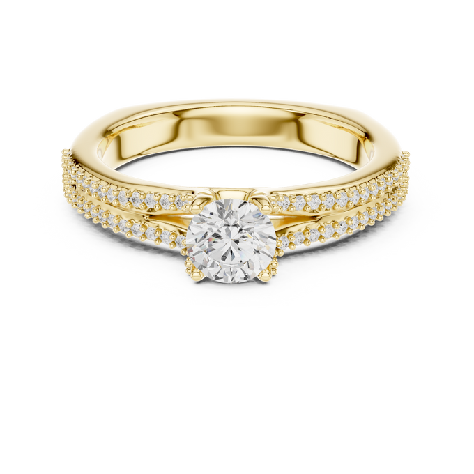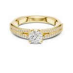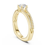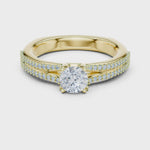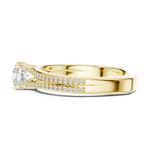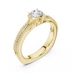 The mesmerizing oval-cut diamond is paired with twin round side stones, creating a look of captivating symmetry. With its diamond-studded band, this ring captures the essence of fairytale romance and everlasting sparkle.