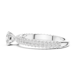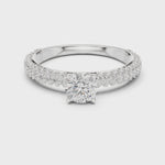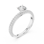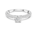 A round-cut diamond radiates from its center, surrounded by rows of pavé-set diamonds that wrap the band in continuous sparkle. A timeless declaration of passion and devotion.