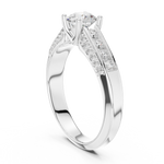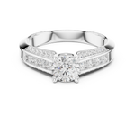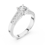 A dazzling round-cut diamond is perfectly balanced atop a sleek, diamond-accented band. Every facet reflects light in endless shimmer — the perfect token of unending love and sophistication.