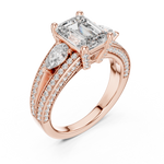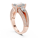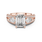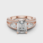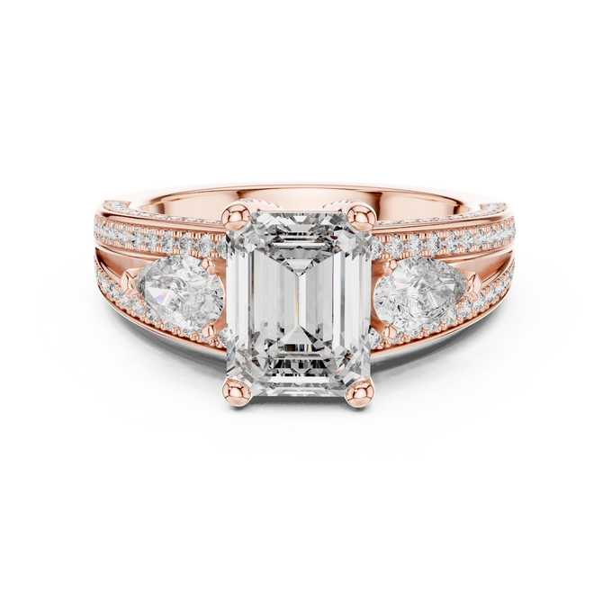 A bold statement of elegance, this emerald-cut diamond ring in gold dazzles with pear-shaped accents and a pavé-split shank. Its intricate design and mirror-like brilliance make it a timeless treasure for the one who defines sophistication and love.