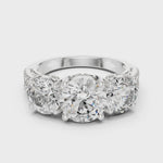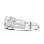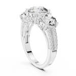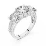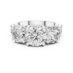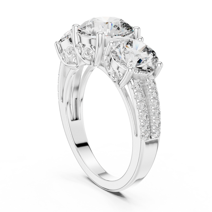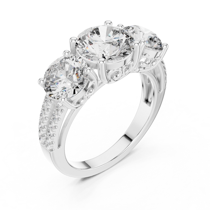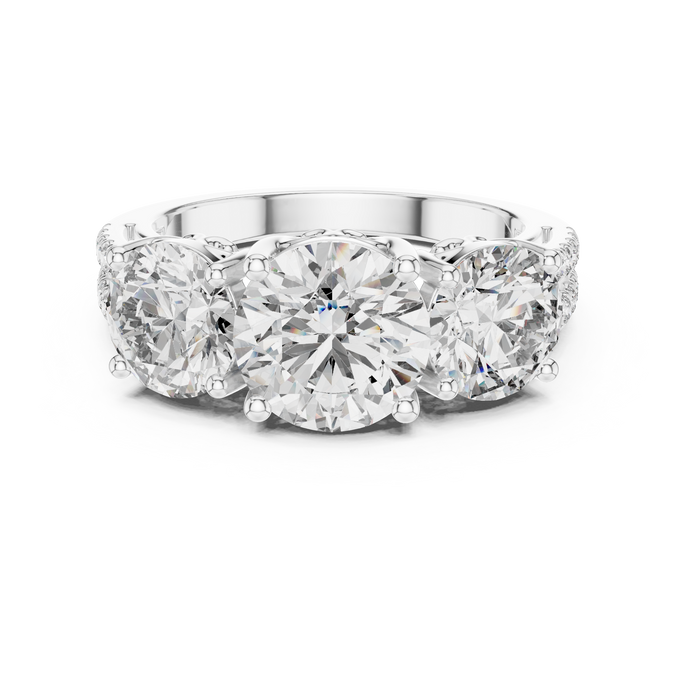 A stunning masterpiece featuring three brilliant round-cut diamonds symbolizing the past, present, and future. The center diamond shines with captivating brilliance, flanked by two equally radiant side stones. Accented with delicate pavé-set diamonds along the band.
