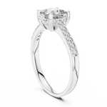 This captivating ring features a radiant princess-cut diamond elevated on a pavé-set band. Every detail reflects light and love, a perfect tribute to devotion that endures forever. A design of timeless grace, it reflects the beauty of everlasting commitment.