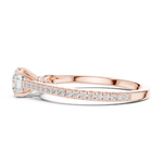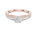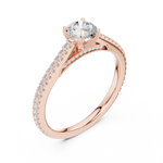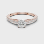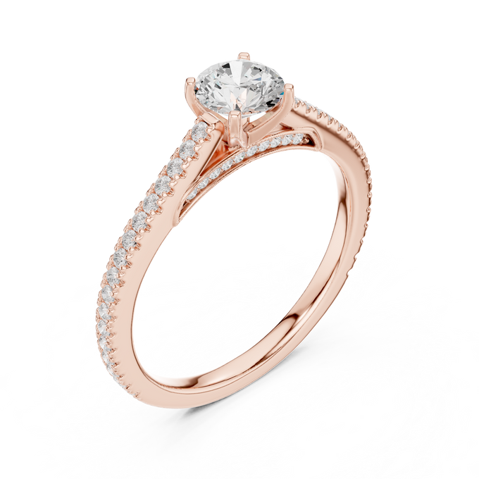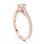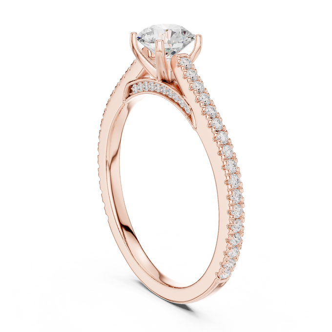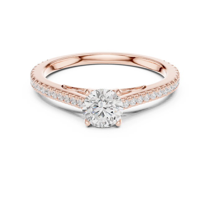 A classic round-cut diamond crowns this elegant design, elevated by a band lined with shimmering accent stones. Its refined craftsmanship captures the light beautifully, symbolizing a promise that glows as brightly as true love itself.