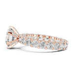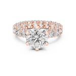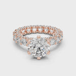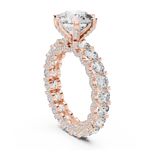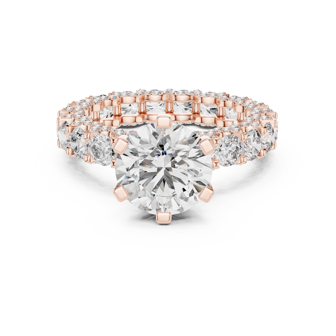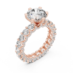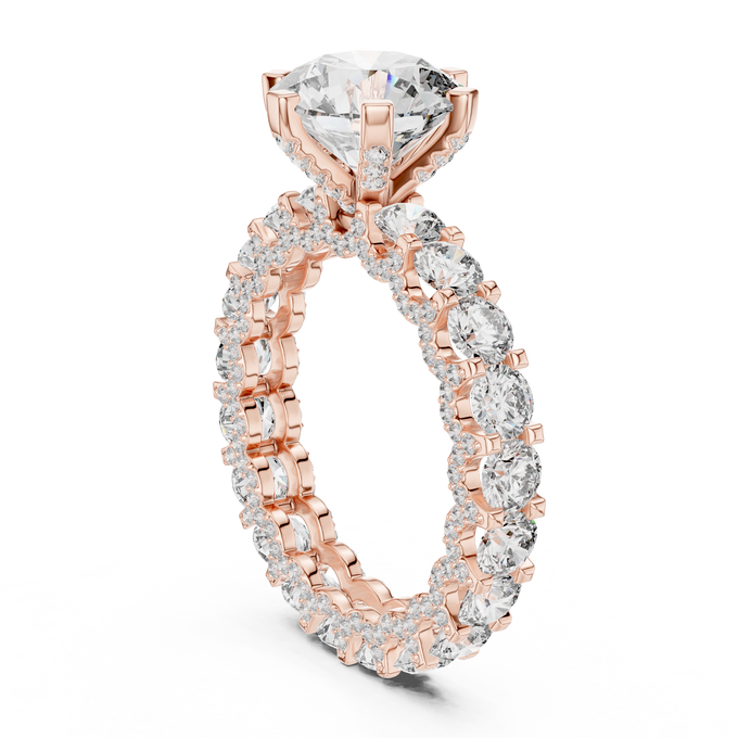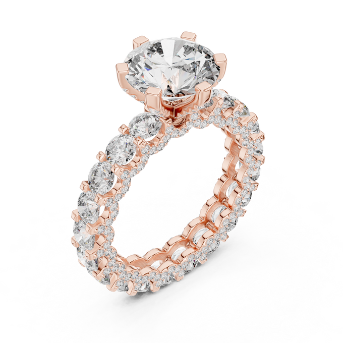 The epitome of refined luxury, this ring showcases a radiant round brilliant-cut diamond with a continuous diamond band. Its flawless symmetry and endless sparkle make it a true symbol of purity, devotion, and grace.