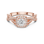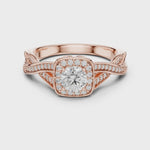 This exquisite ring features a round brilliant-cut diamond encased in a stunning cushion-shaped halo of smaller diamonds. The split shank design enhances its brilliance and balance, creating a captivating interplay of sparkle and grace.