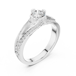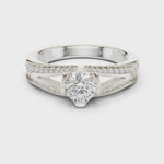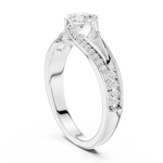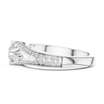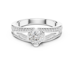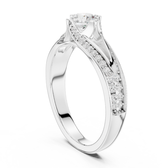 A stunning round-cut diamond rests on a pavé-adorned split band, amplifying its brilliance and beauty. The elegant silhouette offers both strength and grace, capturing eternal allure in a single piece.