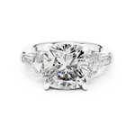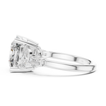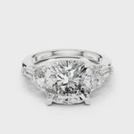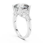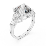 A mesmerizing Cushion-cut diamond takes center stage in this luxurious three-stone design, gracefully complemented by tapered baguette diamonds on each side. The seamless blend of classic and modern brilliance symbolizes everlasting love and refined beauty
