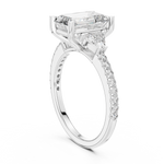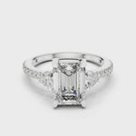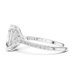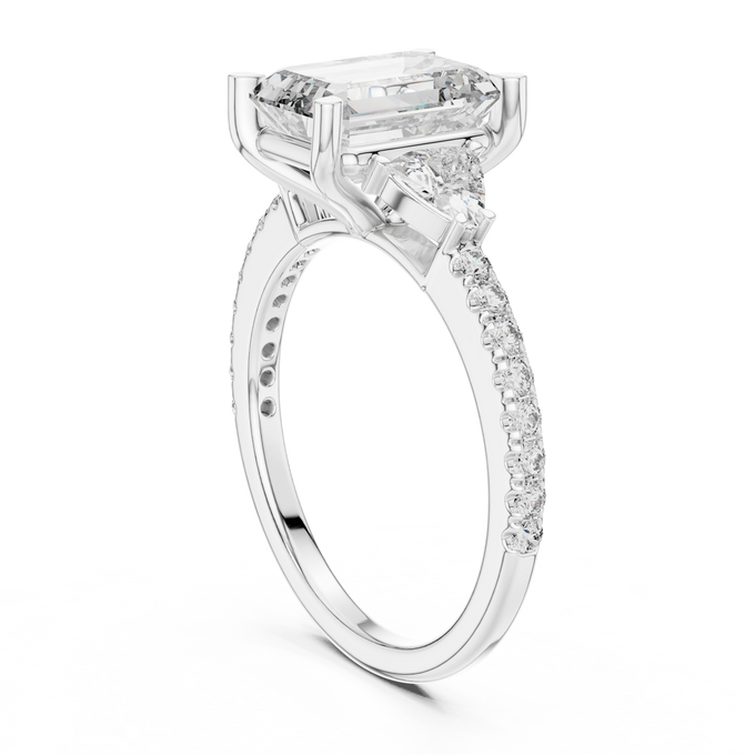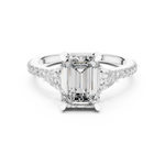 This captivating ring showcases a stunning emerald-cut diamond, framed by two brilliant side stones that enhance its depth and symmetry. The tapered band adorned with shimmering accents completes its timeless charm.