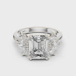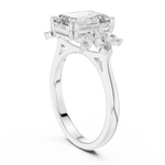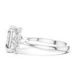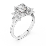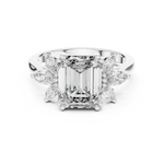 A captivating emerald-cut diamond graces the center of this ring, flanked by two delicate marquise-cut side stones that bloom like petals. The refined silhouette and floral-inspired detailing create a perfect harmony of structure and grace.