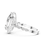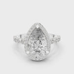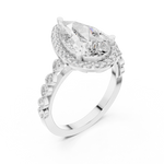 This mesmerizing design features a pear-shaped diamond encircled by a radiant halo of smaller diamonds, amplifying its brilliance and allure. The delicate band adorned with shimmering accents enhances its luxurious charm.