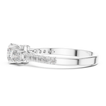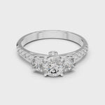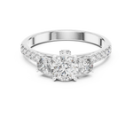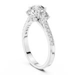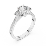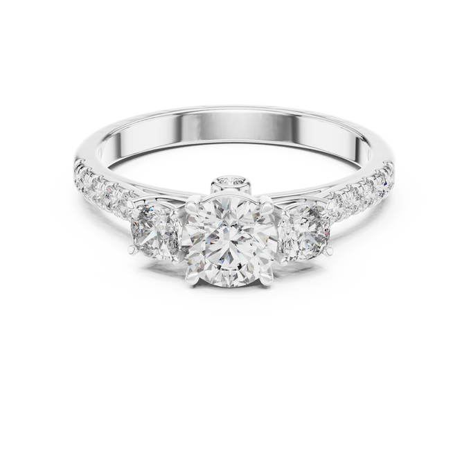 This exquisite ring features a captivating round-cut diamond at its center, complemented by two smaller round diamonds and a shimmering pavé-set band. Each diamond sparkles with remarkable brilliance, symbolizing your past, present, and future together. A timeless expression of love, beauty, and everlasting commitment.