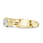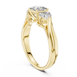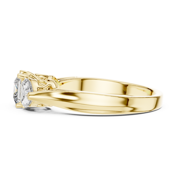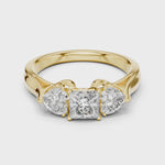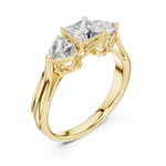 A striking princess-cut diamond takes center stage in this elegant three-stone design, flanked by two heart-shaped diamonds that enhance its brilliance. The balanced symmetry and captivating sparkle represent a timeless bond of love and commitment.