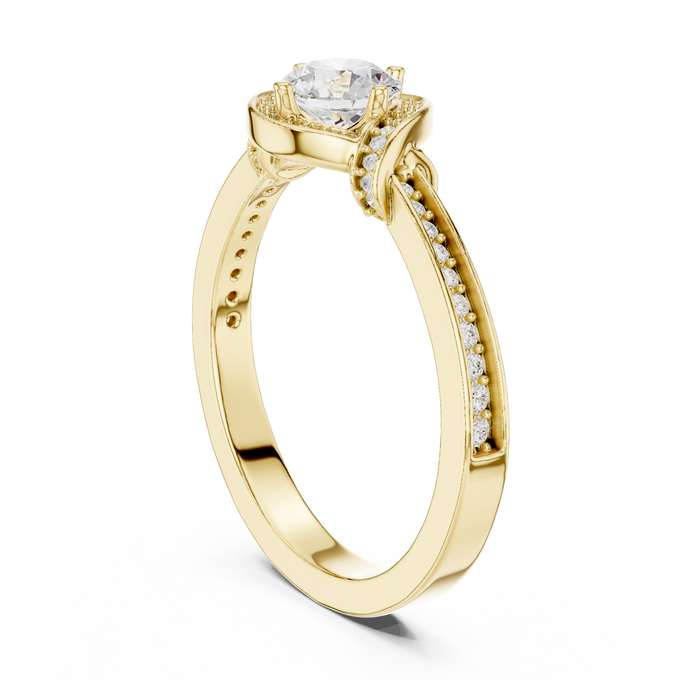 This enchanting ring features a round-cut diamond elevated gracefully above a delicate setting. Its elegant band, accented with fine diamonds, speaks of quiet romance and timeless affection — a true celebration of love’s purity.